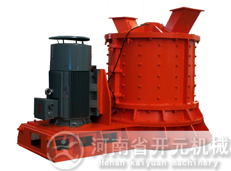 立式復(fù)合破碎機(jī)工作原理:物料由機(jī)器上部垂直落入高速旋轉(zhuǎn)的葉輪內(nèi),在高速離心力的作用下,與另一部分以傘狀形式分流在葉輪。
