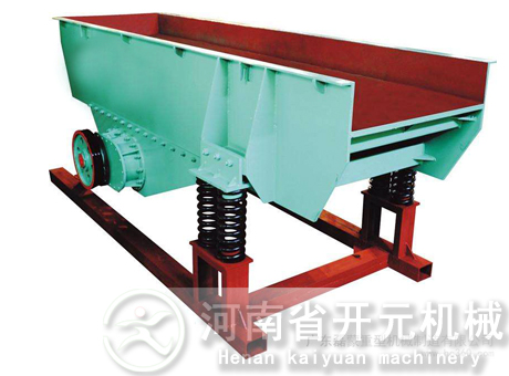 槽式給料機(jī)又稱往復(fù)式或擺動(dòng)式給料機(jī),它是貯礦槽排料應(yīng)用較早的一種給料設(shè)備。型式較多,其結(jié)構(gòu)的共同點(diǎn)是均裝有可控制料層高度的調(diào)節(jié)閘板;在輸料槽下部為一前后移動(dòng)的給料板。其不同點(diǎn)是給料板角度不一樣,一般為沿卸料方向向下傾斜5度以及更大的傾角(小于物料的靜堆積角)和角度為零的水平型等。給料板的動(dòng)作有前后往復(fù)移動(dòng)式,抖動(dòng)式以及擺動(dòng)式等。傳動(dòng)機(jī)構(gòu)均為曲柄回轉(zhuǎn)式。