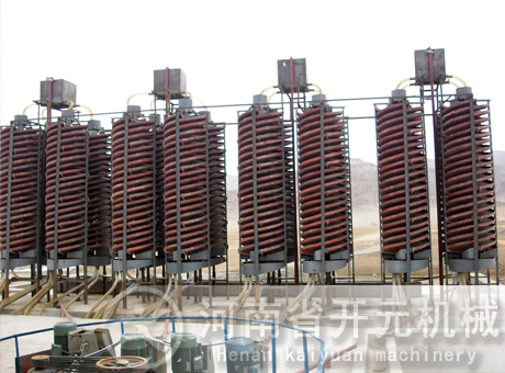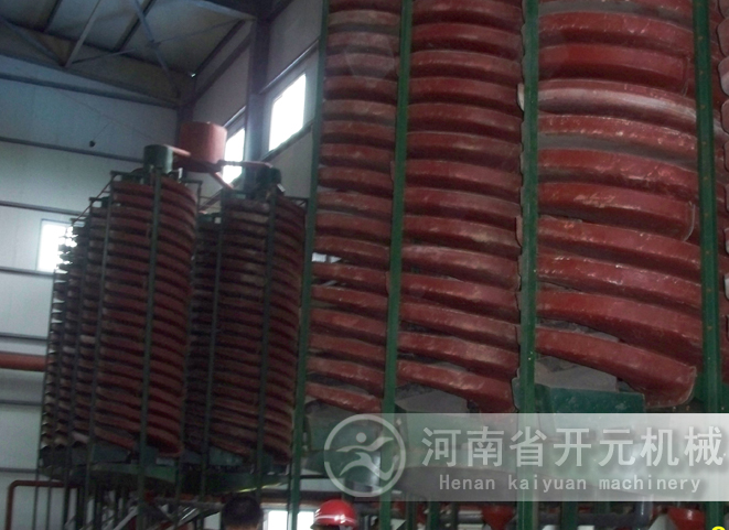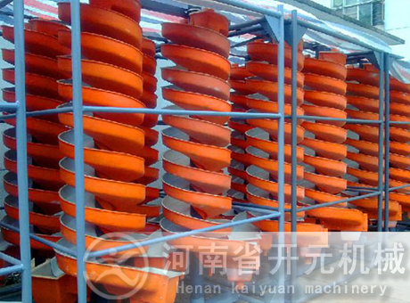 將螺旋溜槽通過螺旋支架立起,校準垂直線,用鐵架固定在合適的位置,由砂泵將礦砂送到螺旋上頂兩個進料口處,加入補充水,調節(jié)礦槳濃度,礦槳自然從高往下旋流,在旋轉的斜面流速中產生一種慣性的離心力,以礦砂的比重、粒度、形狀上的差異,通過旋流的重力和離心力的作用,將礦與砂分開,精礦流入精礦斗用管道接出,尾砂流進尾砂斗用管道接到砂池,再用砂泵排走,完成了選礦的全過程